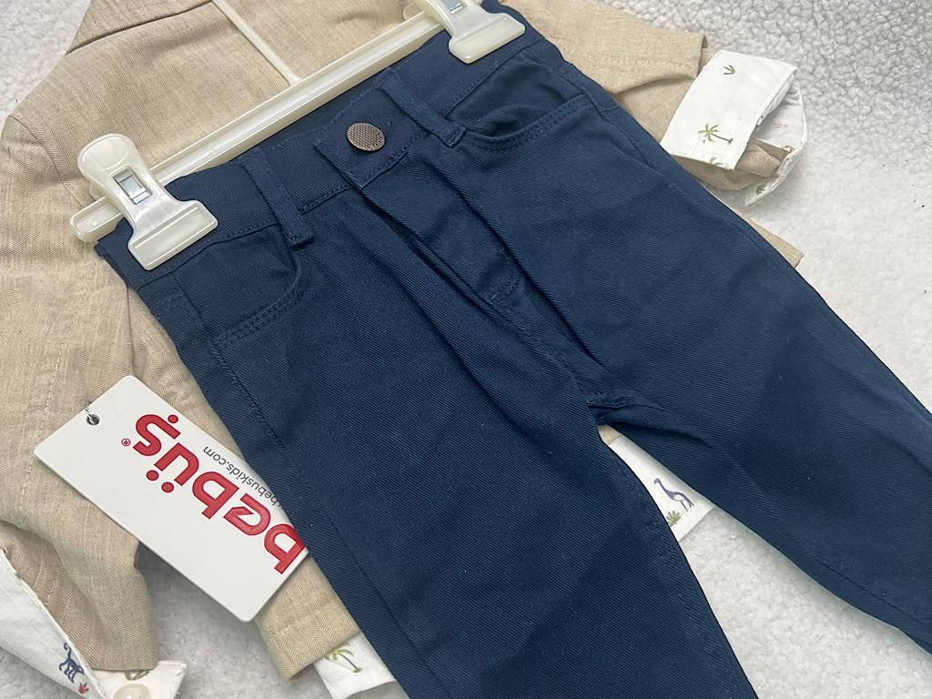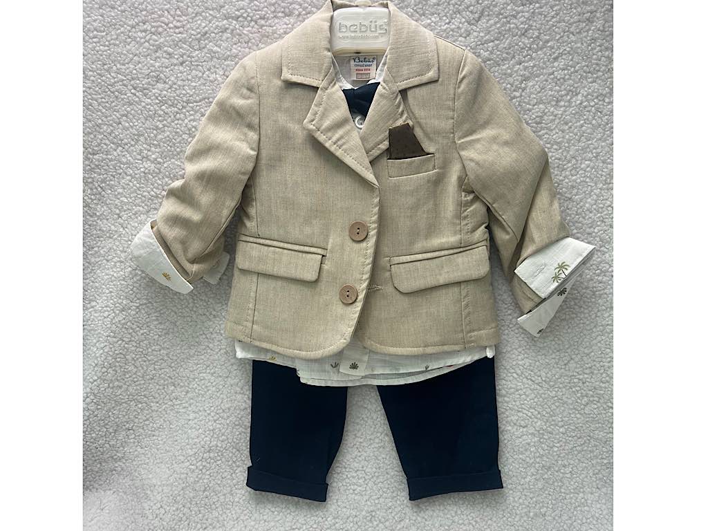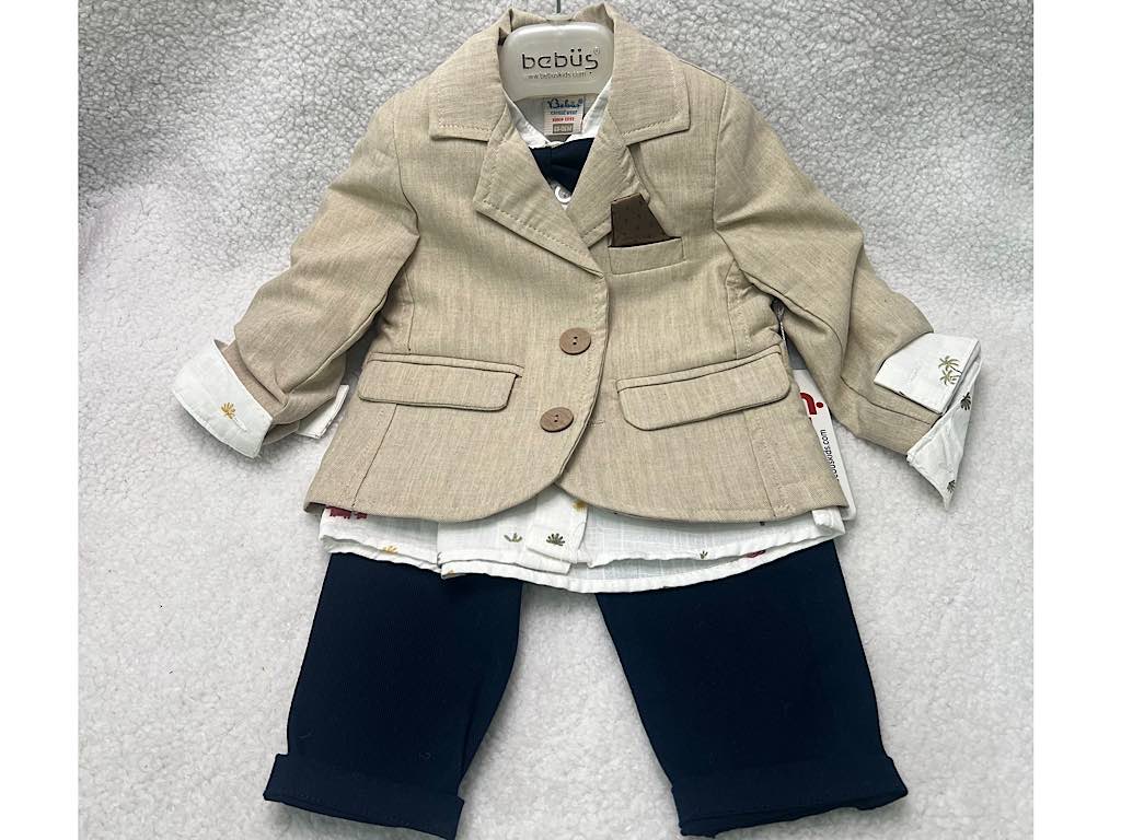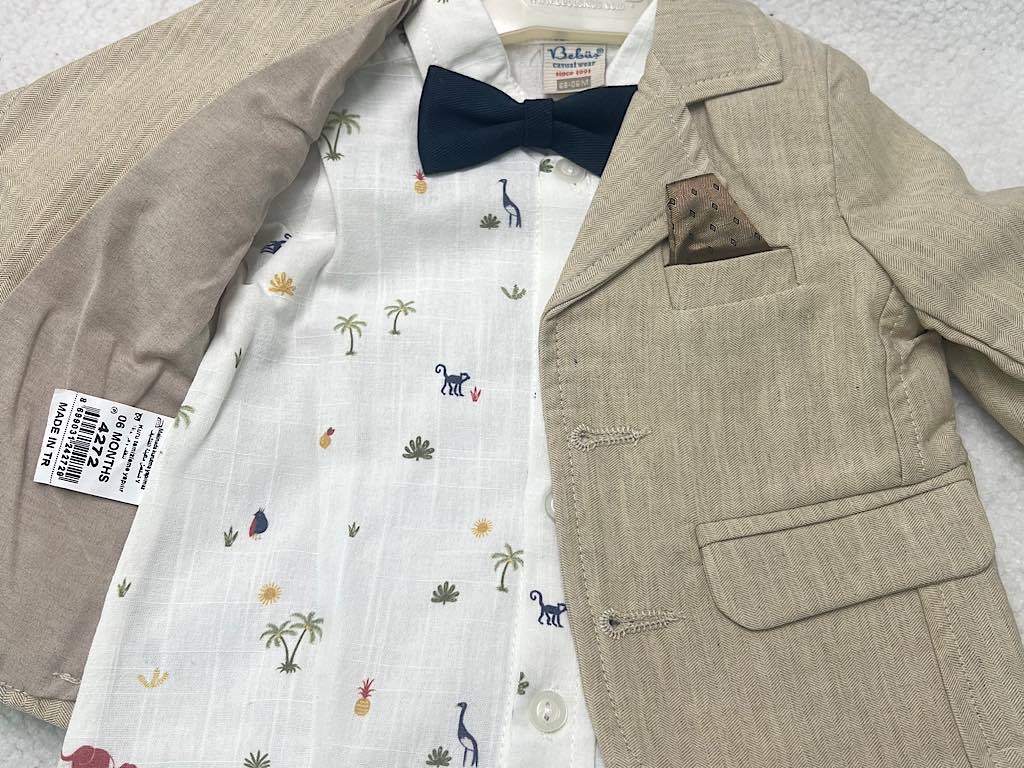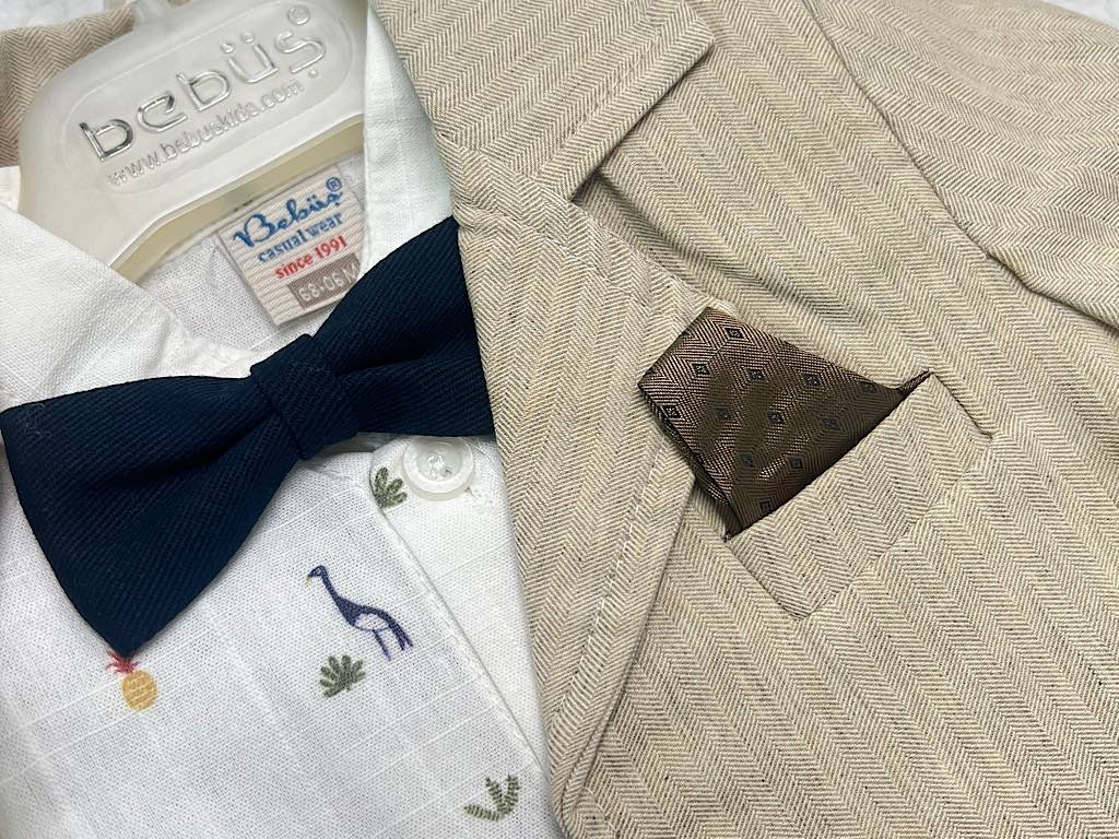 ست مجلسی شامل شومیز طرح دار اسپرت به همراه شلوار کتان سرمه ای که دارای فیکساتور برای تنظیم اندازه کمر می باشد و کت کرم تیره که در جیب اش دستمال جیب قرار دارد و دارای دو نمای جیب پاکتی می باشد.به همراه پاپیون دور کش که قابلیت جدا کردن از لباس را دارد.