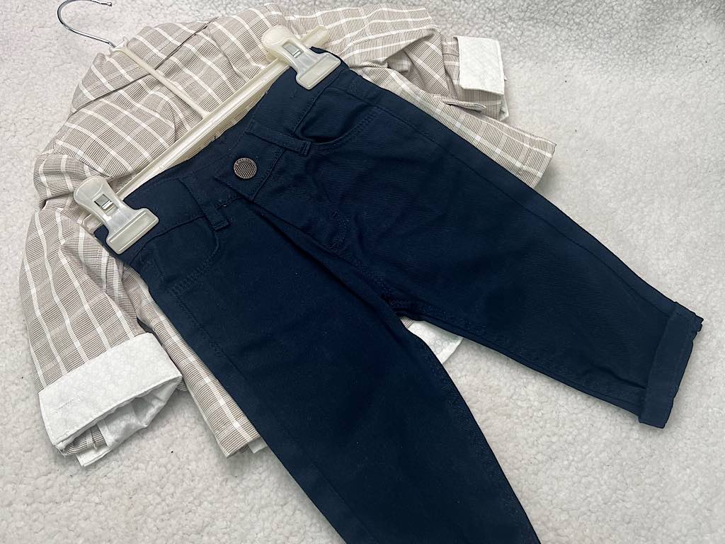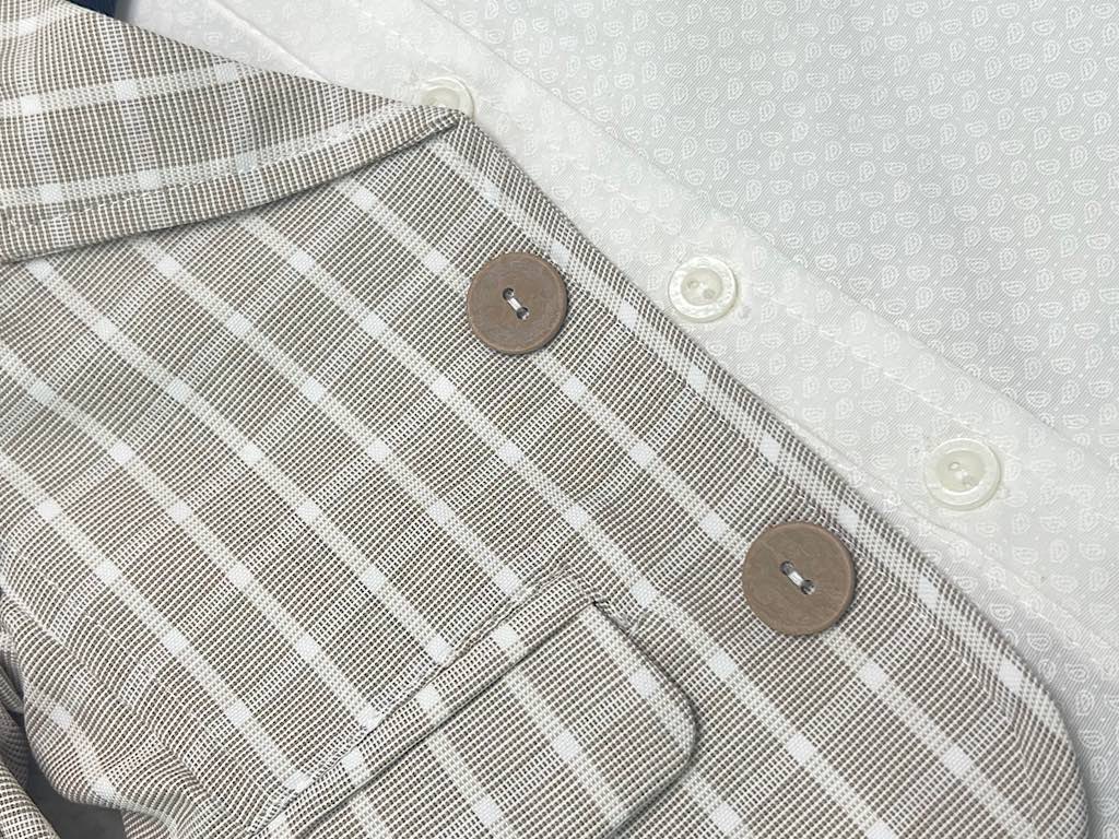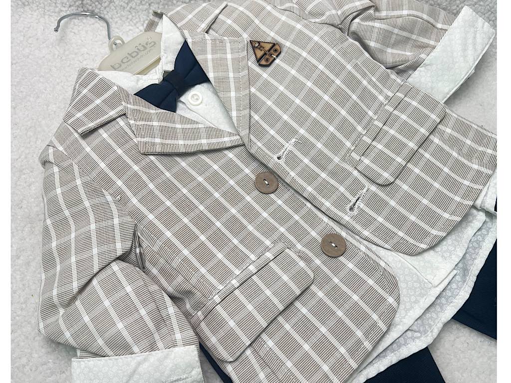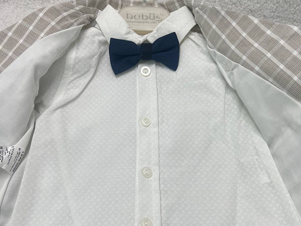 ست مجلسی شامل شومیز با پارچه سفید رنگ زمینه طرح دار به همراه شلوار کتان سرمه ای که دارای فیکساتور برای تنظیم اندازه کمر می باشد و کت چهار خانه کرم تیره که دارای دو نمای جیب پاکتی می باشد به همراه پاپیون سرمه ای دور کش که قابلیت جدا کردن از لباس را دارد.