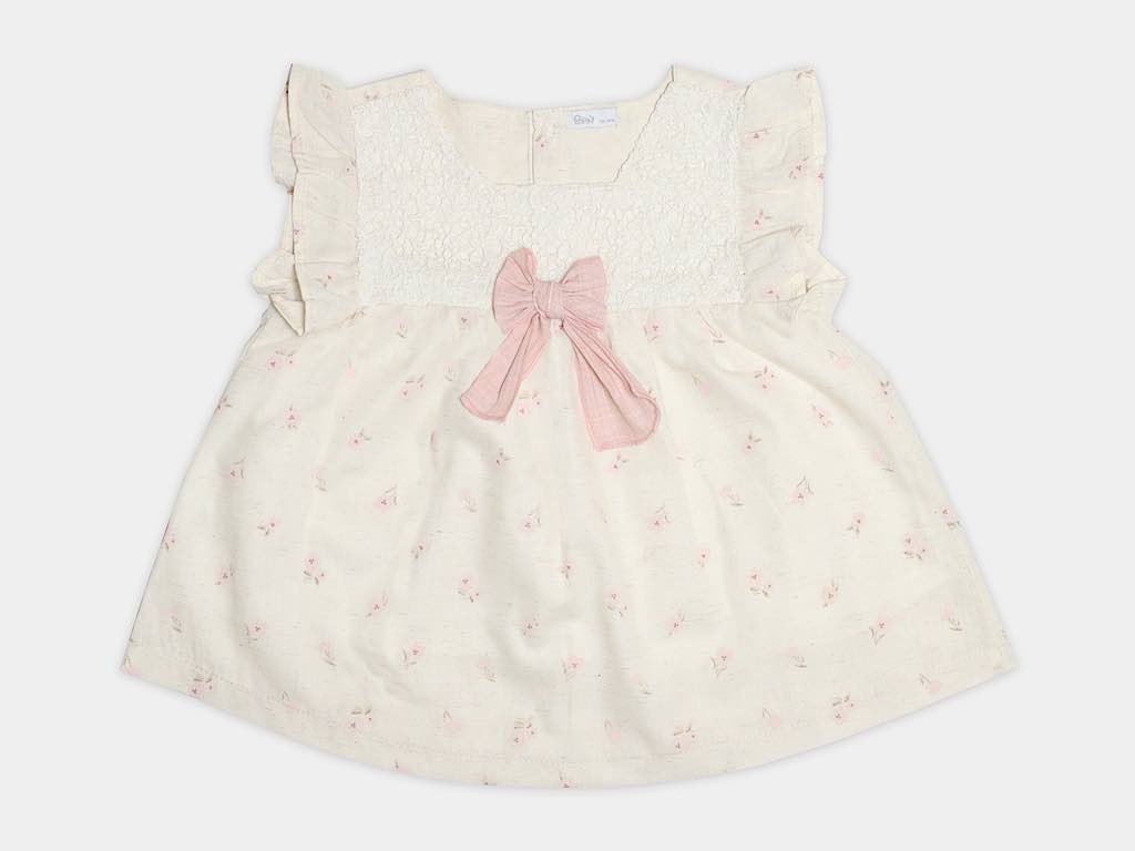 - تونیک کرم رنگ با گل های کالباسی و پاپیون کالباسی که جلو سینه حالت گیپور دارد.