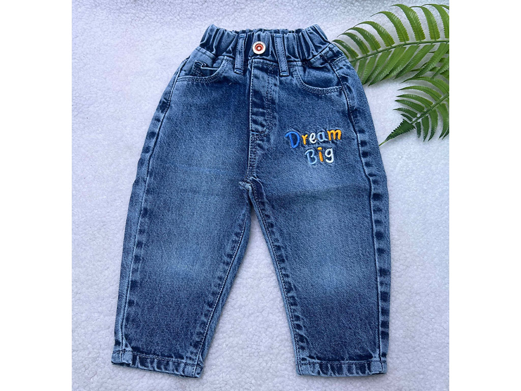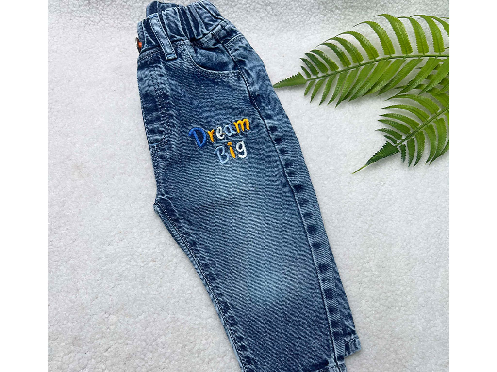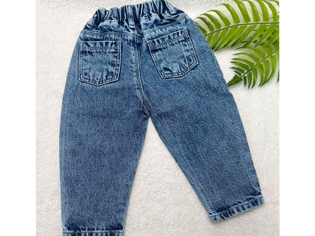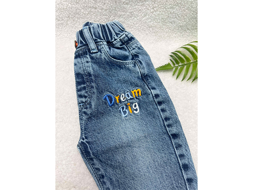 شلوار جین کمرکش مام فیت رنگ آبی طرح گلدوزی رنگی