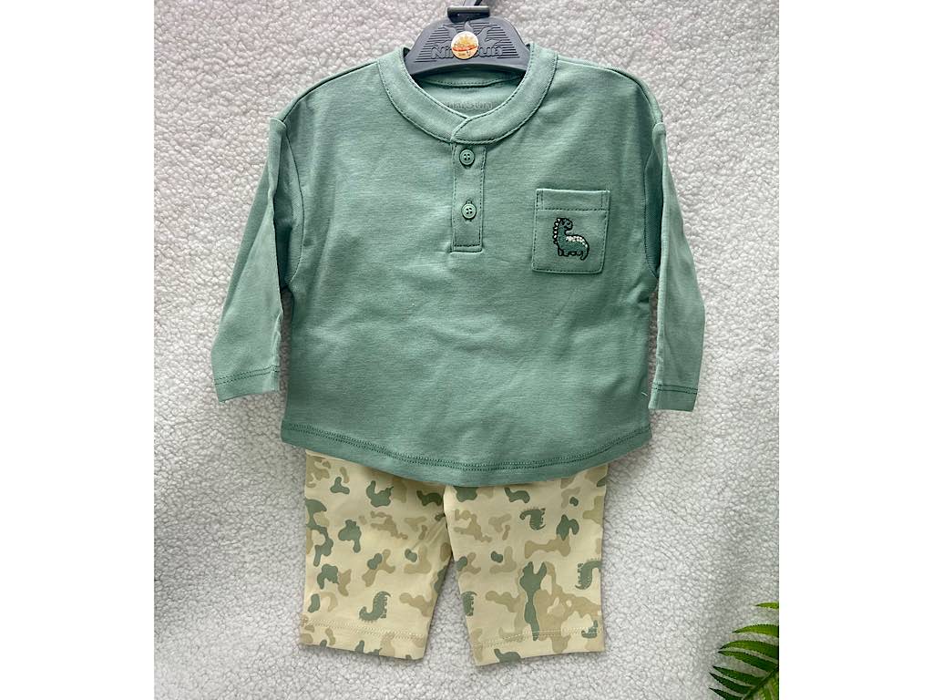 - بلوز آستین بلند سبز رنگ که دارای یک جیب با طرح گلدوزی دایناسور می باشد و یقه دو دکمه است.