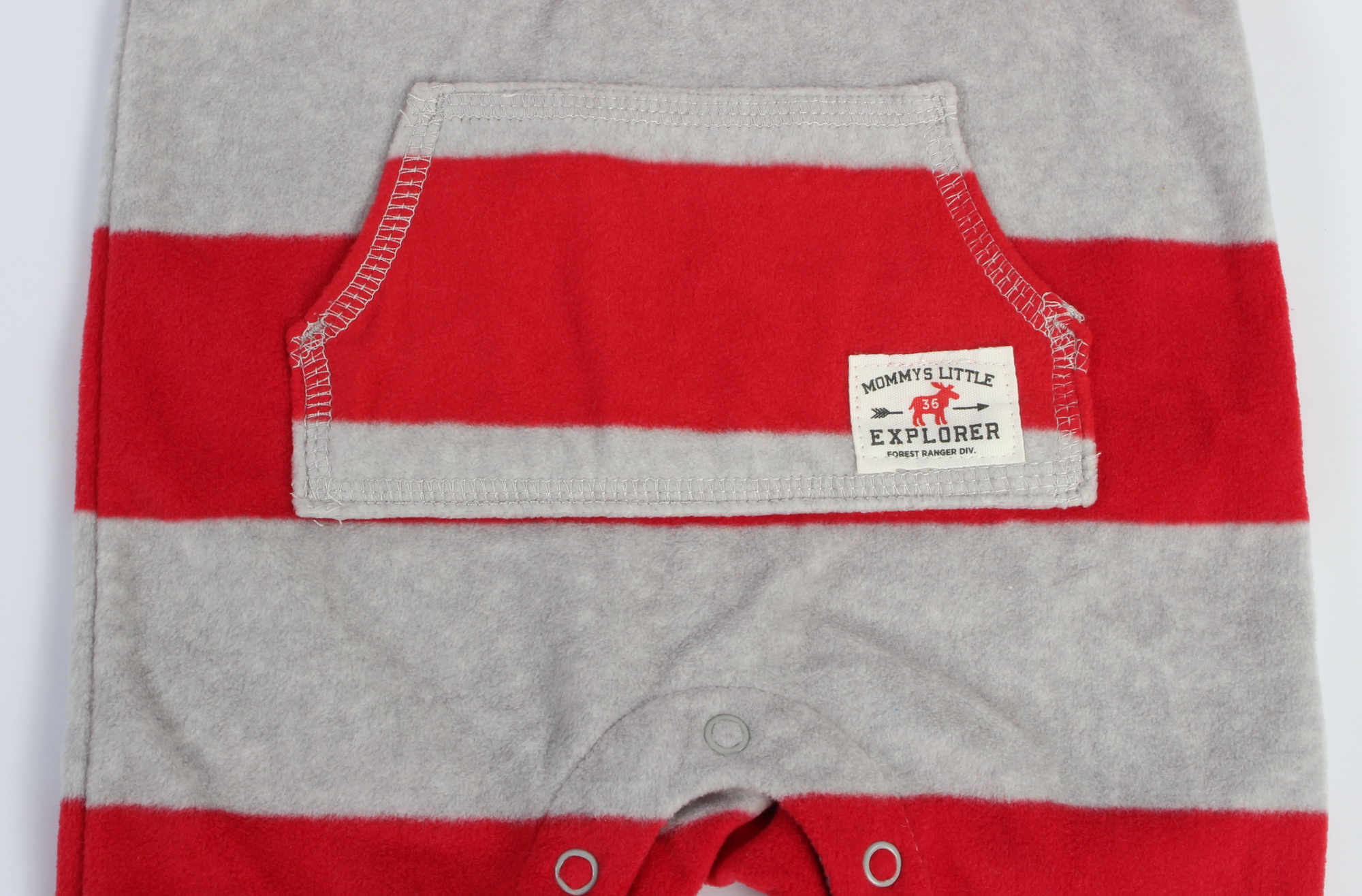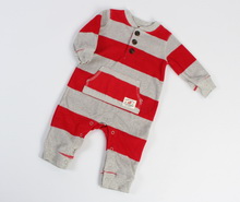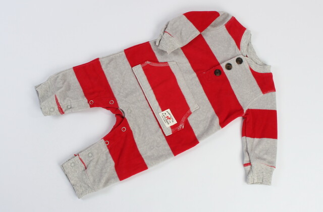 سرهمی کرکی carter's، سرهمی نوزادی پسرانه که جنس آن کرکی می باشد و طرح راه راه خاکستری و قرمز دارد. زیر یقه ی لباس سه دکمه قرار گرفته و یک جیب یکسره جلوی سرهمی کار شده است.پایین لباس دکمه های فشاری وجود دارد و سرآستین ها و دمپای شلوار کشبافت می باشند.