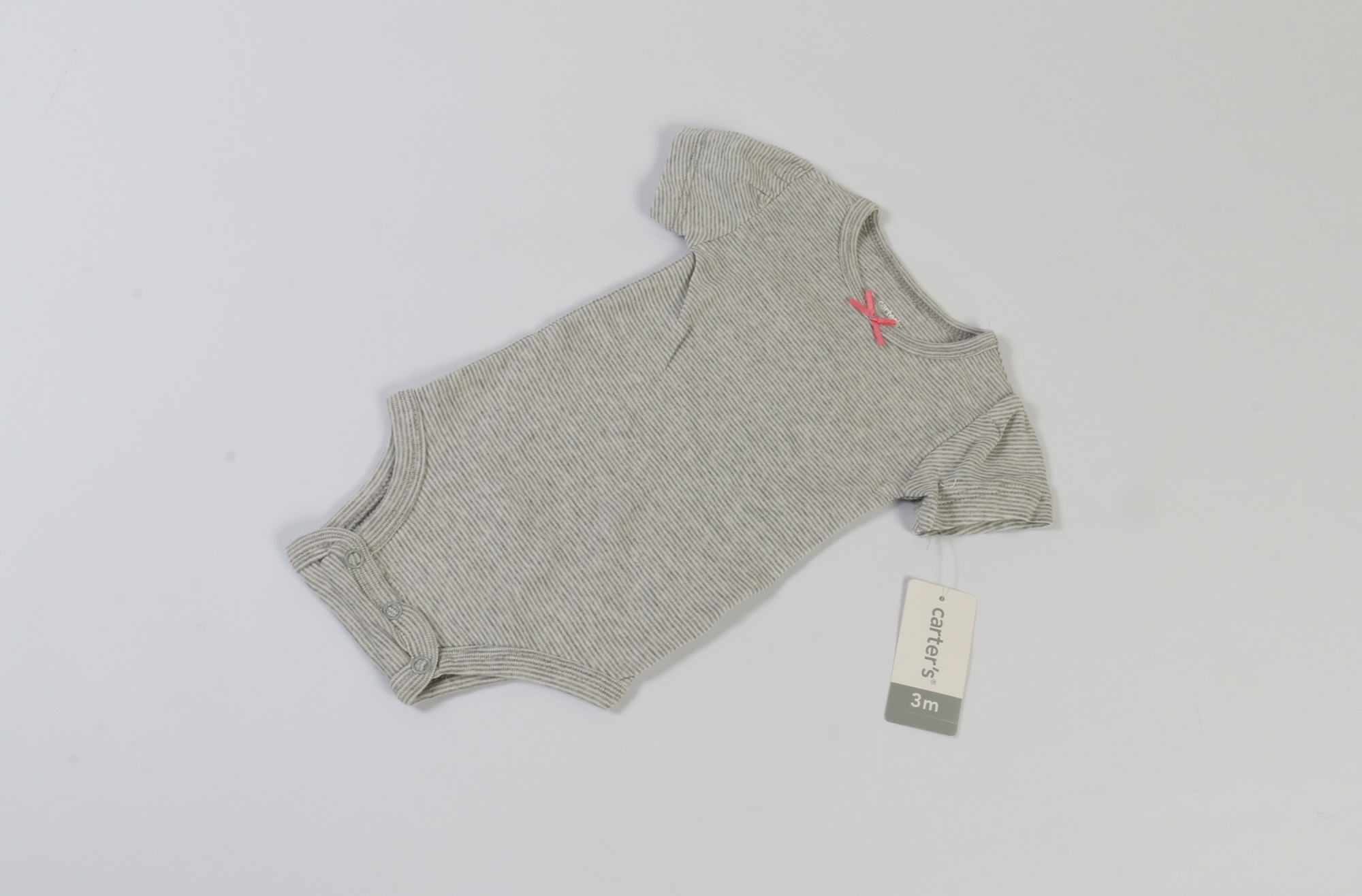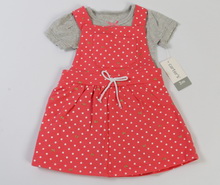 #سارافون و بادی نوزادی دخترانه کارترز که سارافون صورتی خالدار با خال های سفید و بادی خاکستری راه راه می باشد.