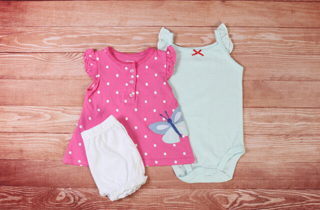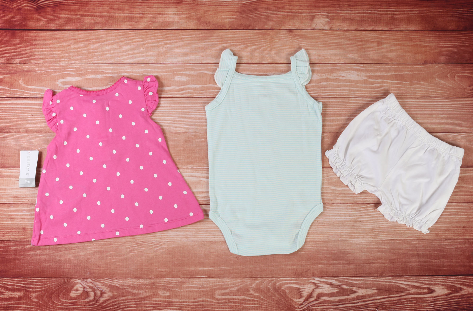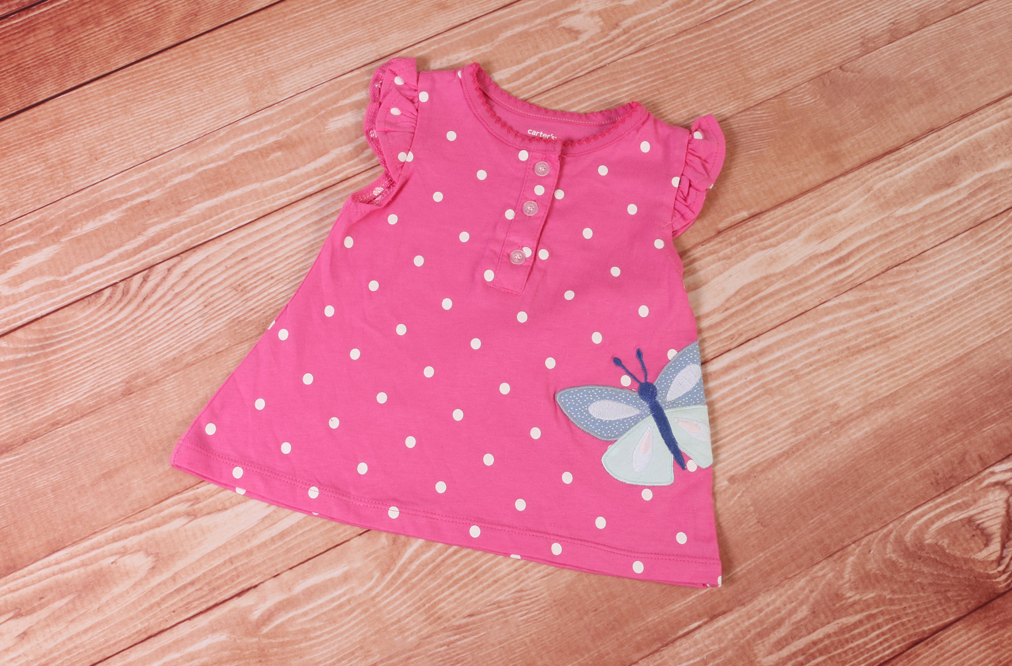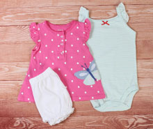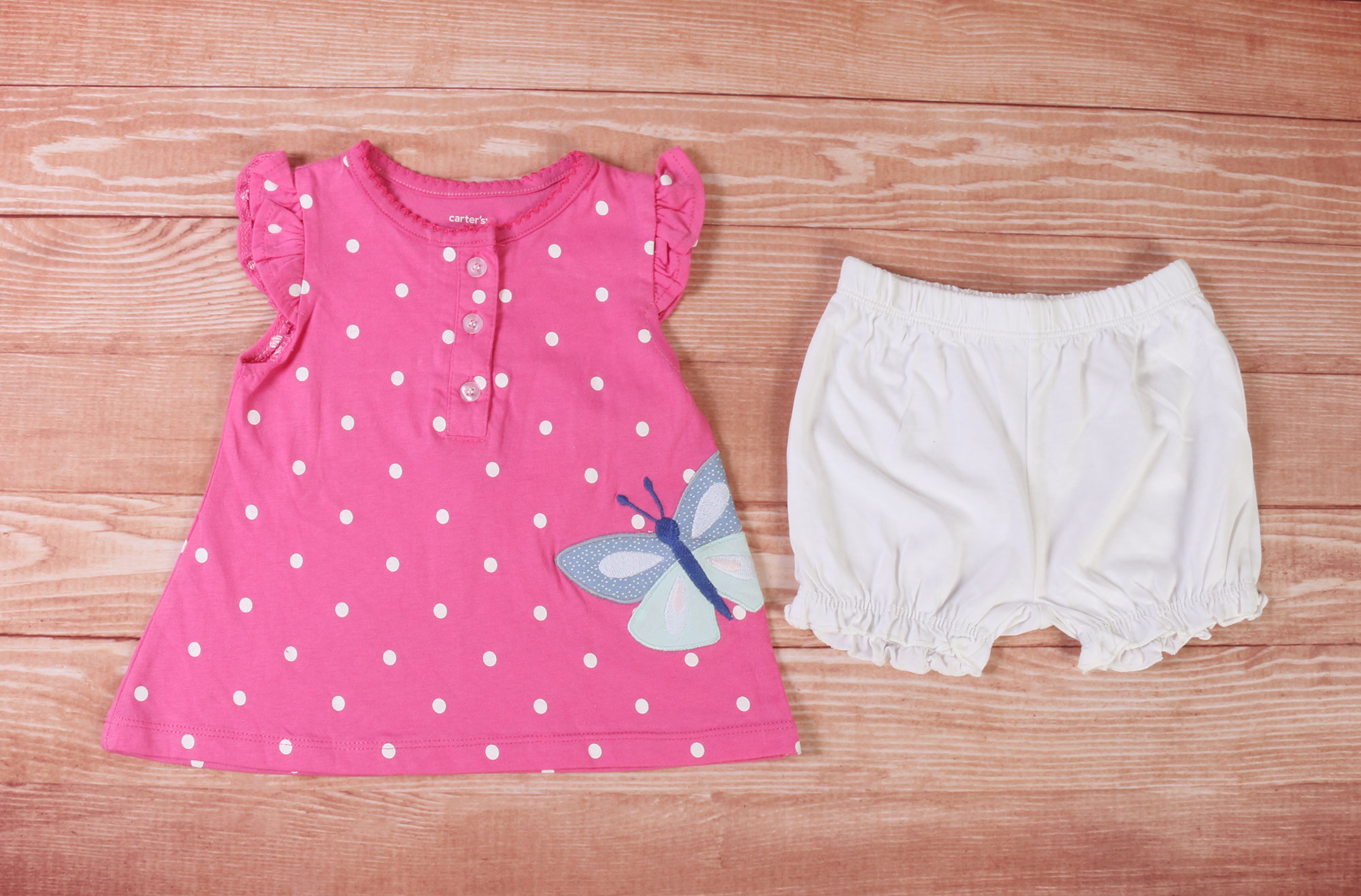 سه تکه کارترز carter's، ست سه تکه نوزادی دخترانه که شامل تونیک، بادی و شلوارک می باشد. تونیک آن آستین کوتاه با یقه ی گرد و به رنگ صورتی مایل به سرخابی با طرح خالهای سفید بوده و در روی دامن طرح تکه دوزی یک پروانه وجود دارد که به زیبایی آن افزوده است. پیراهن در جلو سه دکمه دارد که باعث سهوات در تعویض لباس کودک دلبندتان خواهد شد. بادی آستین حلقه ای و به رنگ راه راه سبز روشن و سفید رنگ بوده و شبیه یک تاپ مجلسی می باشد. بادی دور تا دور لبه دوزی شده و در پایین سه دکمه ی فشاری دارد تا راحت تر بتوانید آن را بر تن دلبندتان بپوشانید. شلوارک این ست، کمرکش و به رنگ سفید می باشد. دمپای شلوارک کشدوزی شده و در جلو دو نوار تزیینی چین دوزی شده است. این ست از پارچه ی 100% کتان می باشد که با توجه به لطافت و نرمی و خنکی این نوع پارچه، می توانید این لباس را در دو فصل بهار و تابستان که هوا گرم است بر تن دلبندتان بپوشانید و کودک نیز در آن احساس آرامش و راحتی کند.