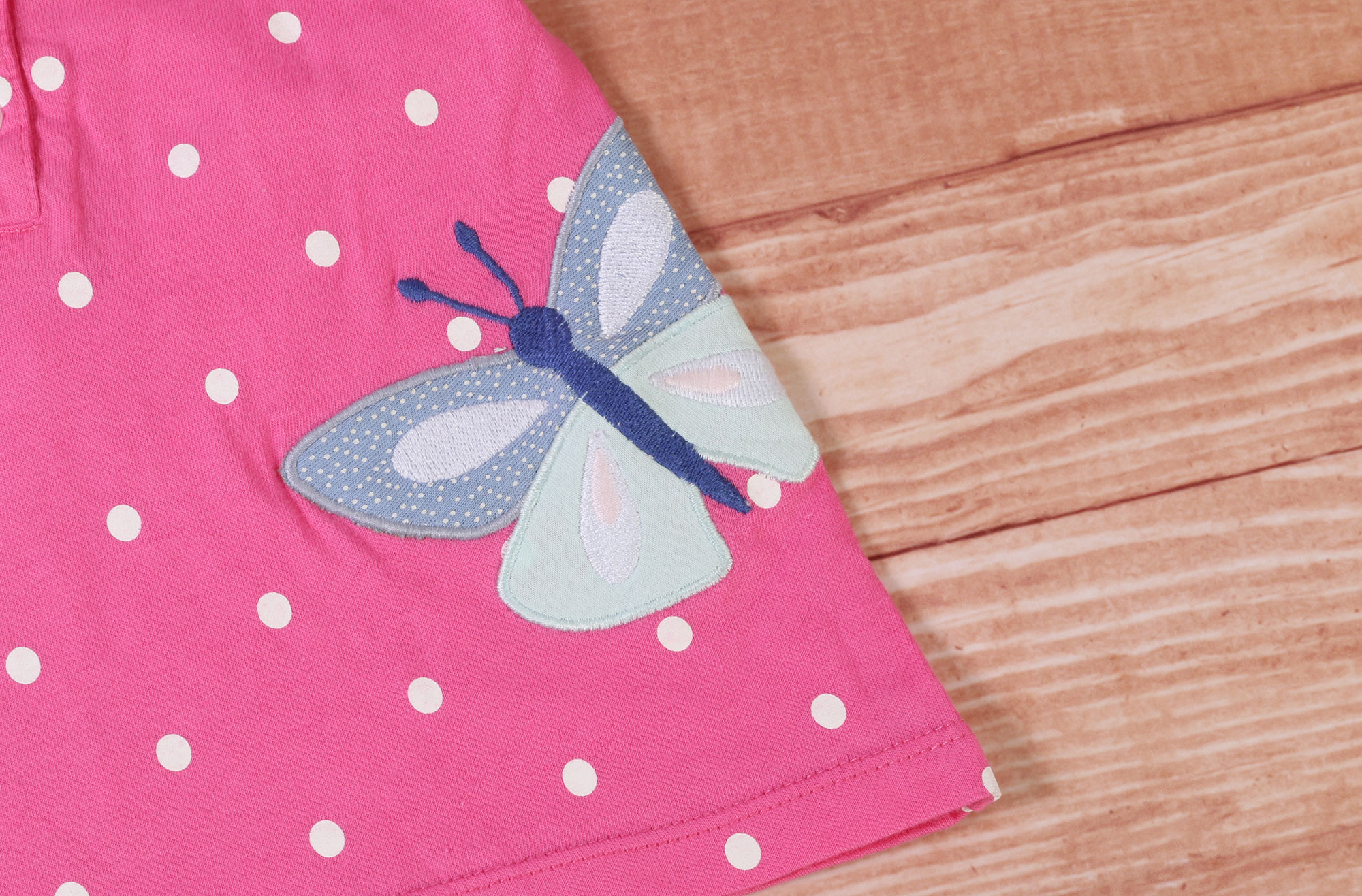 #ست سه تکه نوزادی دخترانه شامل یک عددپیراهن صورتی با طرح پروانه، یک عدد بادی زیر دکمه دار استین حلقه ای و شلوارک کمر کش به رنگ سفید می باشد.