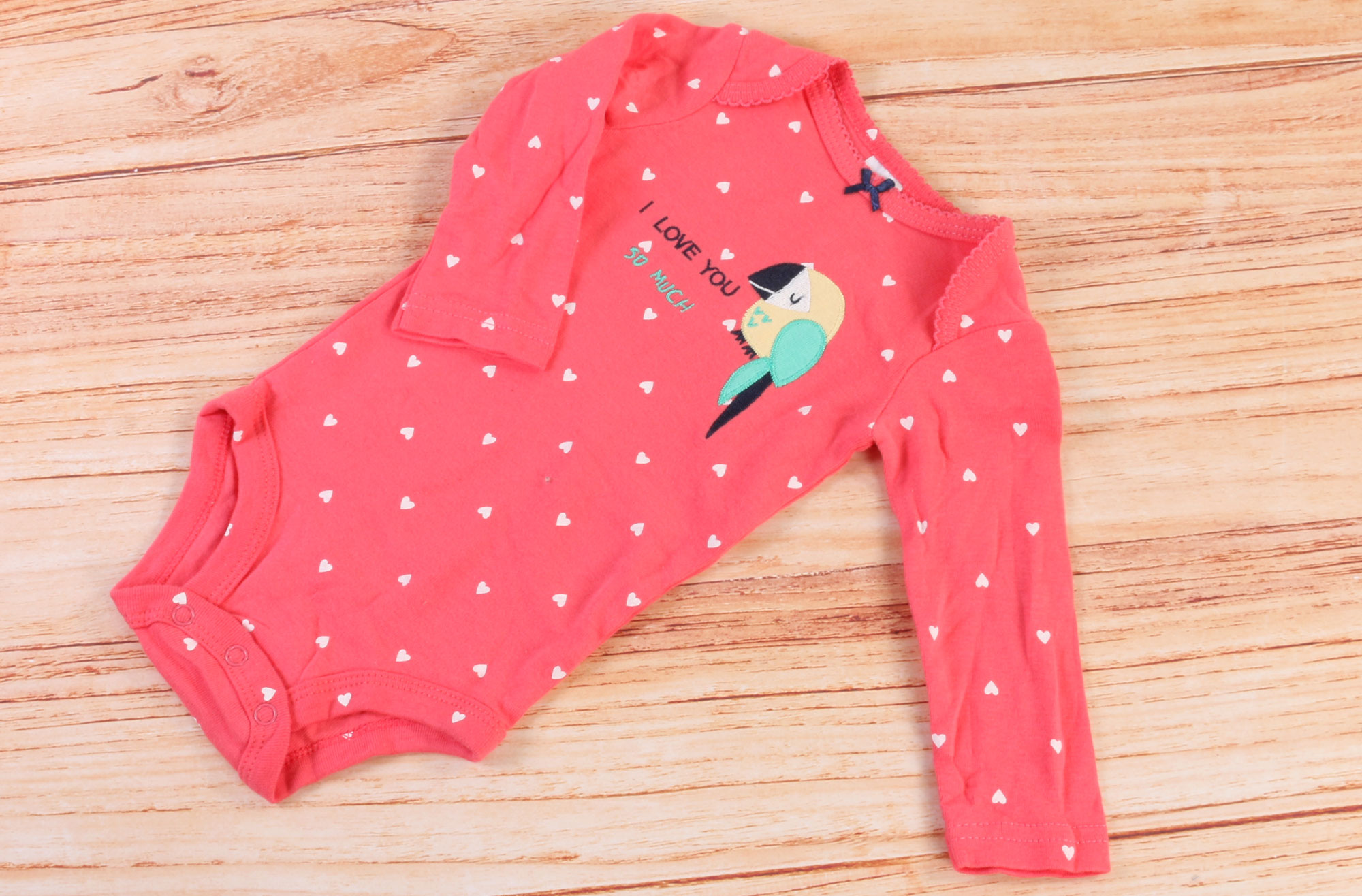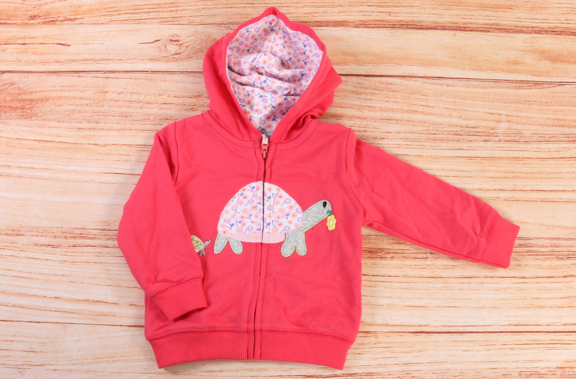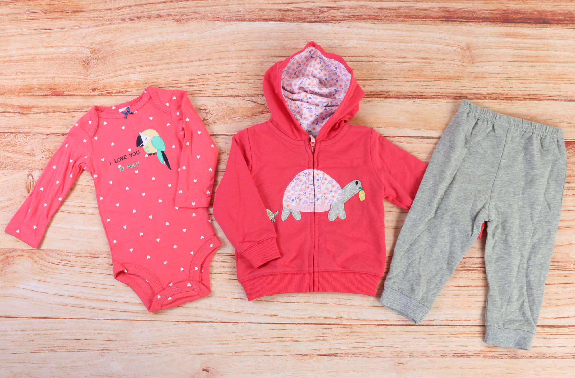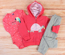 ست سه تکه نوزادی، ست سه تکه نوزادی دخترانه که شامل سویشرت، بادی و شلوار می باشد. رنگ زمینه بادی گلبهی است و پارچه لباس دارای طرح قلب های سفید و ریز می باشد و بادی در جلو دارای طرح طوطی زیبایی است. ضمنا بادی آستین بلند و زیردکمه دار است و دارای یقه مدل فرشته می باشد. سویشرت نیز گلبهی پررنگ است و دارای کلاه می باشد که داخل کلاه نیز دارای آستر گلدار است. سویشرت در جلو با زیپ بسته می شود و سرآستین ها و پایین آن نیز کشبافت می باشد. جلوی سویشرت طرحی بزرگ و زیبا از یک لاک پشت به صورت گلدار تکه دوزی شده که جذابیت این لباس نوزادی را چندین و چند برابر نموده است. ضمنا یک عدد شلوار خاکستری با طرحی شیک و ساده این ست زیبا را تکمیل می نماید که شلوار کمرکش است و دم پای آن کشبافت می باشد. جنس لباس نیز 100 درصد کتان (نخ پنبه) است و جنس داخلی شلوار و سویشرت دورس می باشد.
