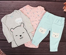 سه تکه کارترز carter's، ست سه تکه نوزادی دخترانه که شامل بادی، بلوز و شلوار می باشد. بادی به رنگ صورتی است و پارچه لباس دارای طرح گل های آبی و سفید می باشد. بادی آستین کوتاه و زیردکمه دار بوده و یقه آن مدل فرشته است. بلوز نیز راه راه خاکستری و سفید می باشد و طرح بزرگی از یک گربه بامزه جذابیت این لباس نوزادی را چند برابر نموده است. بلوز آستین بلند است و مدل یقه آن مدل فرشته می باشد. شلوار این ست چند تکه نیز سبزآبی بوده و کمر آن کش است. در قسمت زانوی شلوار نیز طرح سر گربه ای بامزه تکه دوزی شده که بر زیبایی این ست کارترز افزوده است. جنس این چند تکه کارترز 100 درصد کتان (نخ پنبه) می باشد و کودک دلبندتان در آن احساس خوب و راحتی خواهد داشت و این ست دخترانه گزینه مناسبی برای سیسمونی کودک دلبند شما می باشد.
