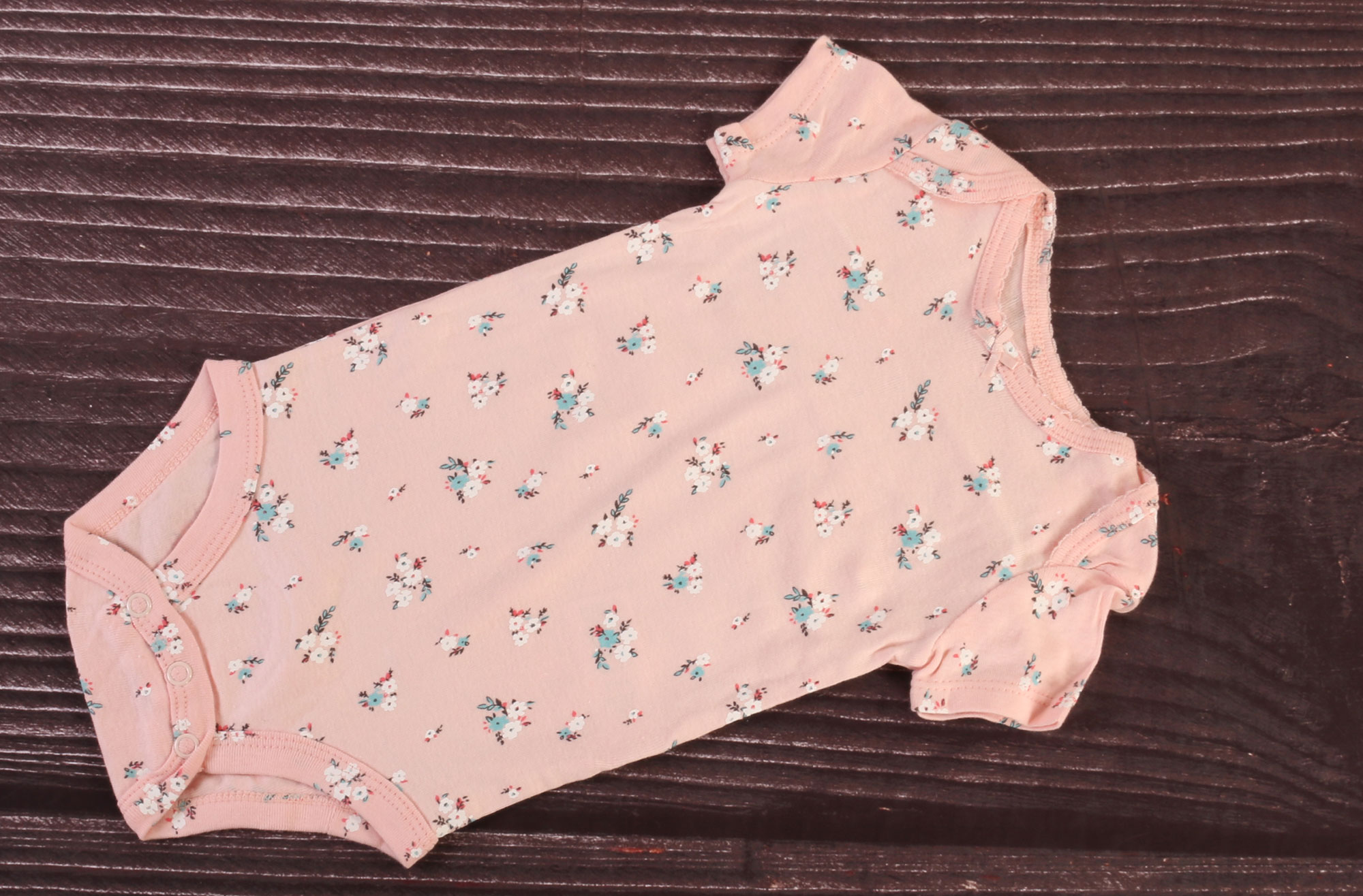 #ست سه تکه نوزادی دخترانه که شامل بادی صورتی گلدار، بلوز راه راه و شلوار سبزابی می باشد.