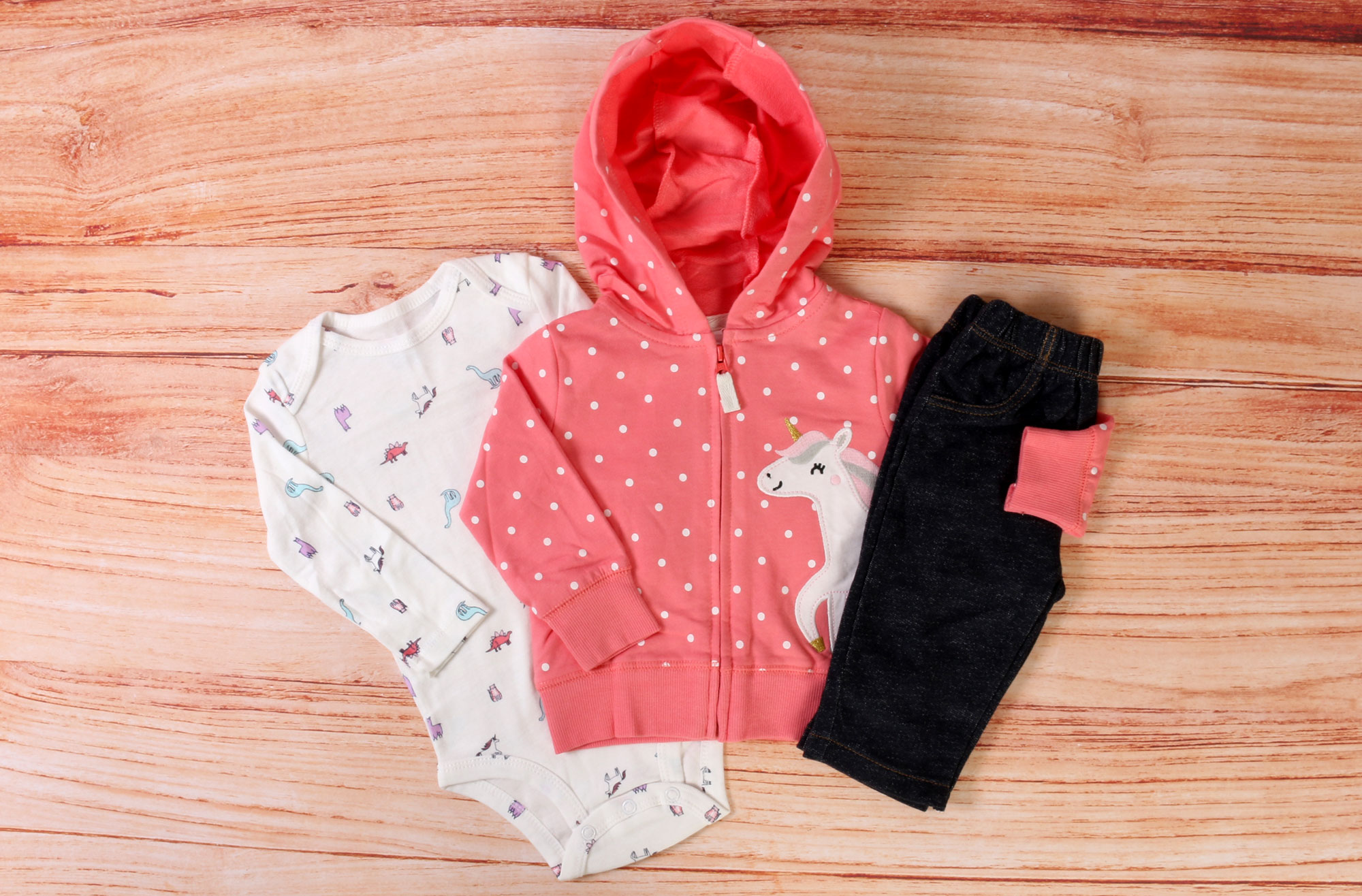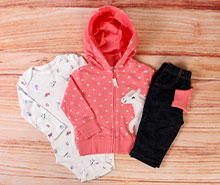 سه تکه کارترز carter's، ست سه تکه نوزادی دخترانه که شامل سویشرت، بادی و شلوار می باشد. رنگ زمینه بادی سفید است و پارچه لباس دارای طرح دایناسورهای رنگارنگ می باشد و ضمنا بادی آستین بلند و زیردکمه دار است و دارای یقه مدل فرشته می باشد. سویشرت نیز گلبهی خالدار با خال های سفید است و دارای کلاه می باشد. سویشرت در جلو با زیپ بسته می شود و سرآستین ها و پایین آن نیز کشبافت می باشد. جلوی سویشرت طرحی بزرگ و زیبا از یک اسب سفید با یال صورتی تکه دوزی شده که جذابیت این لباس نوزادی را چندین و چند برابر نموده است. ضمنا یک عدد شلوار سرمه ای تیره با طرحی شیک و ساده این ست زیبا را تکمیل می نماید که شلوار کمرکش است و دارای جیب نما می باشد. جنس لباس نیز 100 درصد کتان (نخ پنبه) است و جنس داخلی شلوار و سویشرت دورس می باشد. این ست کارترز زیبا گزینه ای مناسب برای سیسمونی دلبند شما است که به کمک آن می توانید لباس های گرم دلبند خود را تکمیل نمایید.