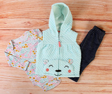 #ست سه تکه نوزادی دخترانه کارترز که شامل جلیقه کلاهدار ابی مایل به سبز، بادی گلدار و شلوار سرمه ای تیره می باشد.