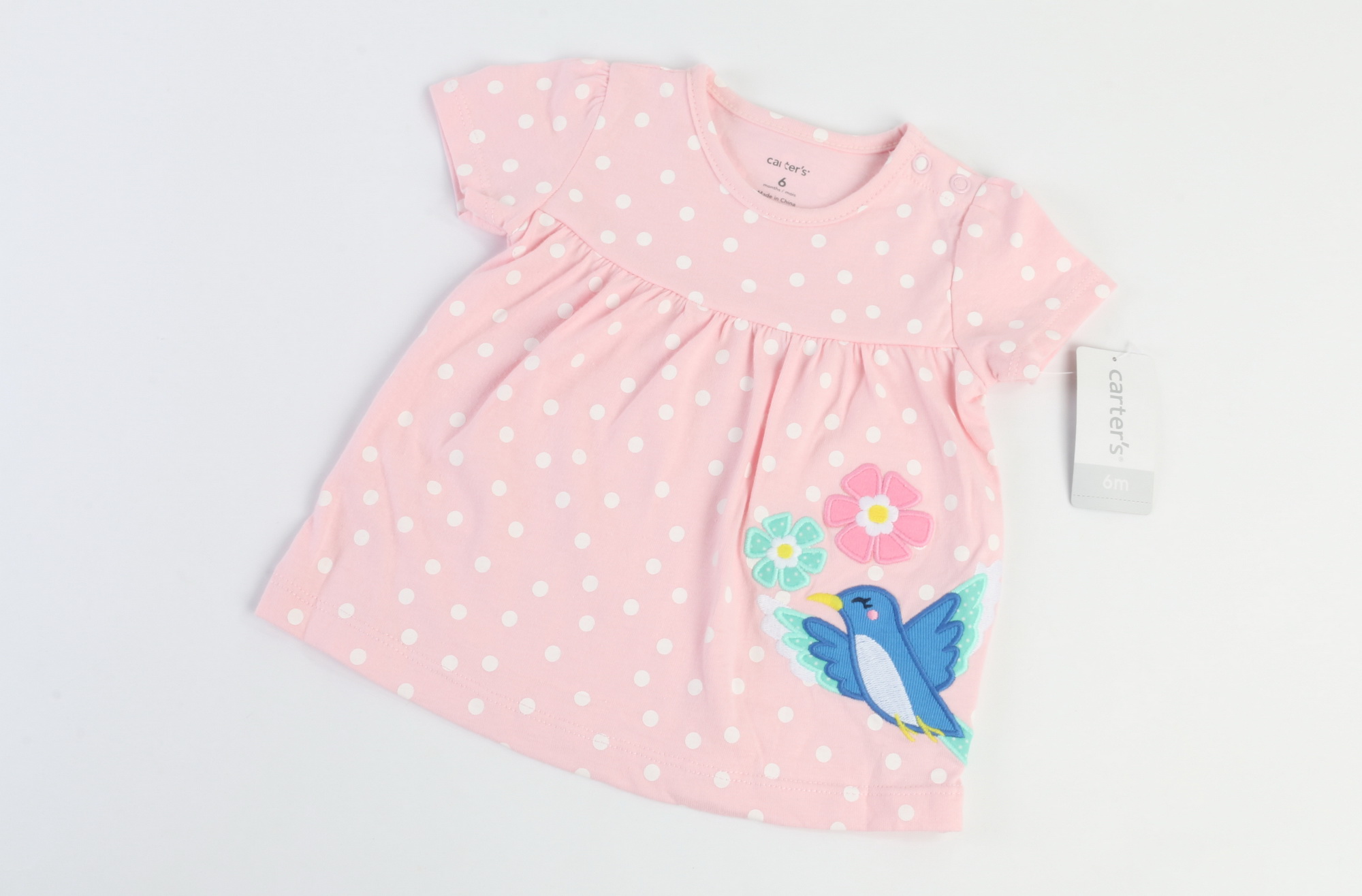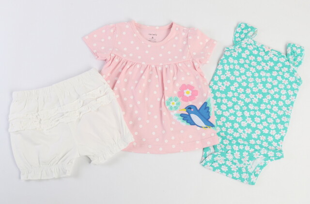 سه تکه کارترز carter's، ست سه تکه نوزادی دخترانه که شامل پیراهن، بادی و شلوارک می باشد. پیراهن آن آستین کوتاه با یقه ی گرد و به رنگ صورتی با طرح خالهای سفید بوده و در روی دامن طرح تکه دوزی یک پرنده با دو گل دارد. پیراهن در جلو برش خورده و دامن با چینهای ریز و زیبایی به بالاتنه دوخته شده است. بادی آستین حلقه ای و به رنگ سبز با طرح شکوفه های سفید رنگ بهاری بوده و شبیه یک تاپ مجلسی می باشد. بادی دور تا دور لبه دوزی شده و در پایین سه دکمه ی فشاری دارد تا راحت تر بتوانید آن را بر تن دلبندتان بپوشانید. شلوارک این ست، کمرکش و به رنگ سفید می باشد. دمپای شلوارک کشدوزی شده و در جلو دو نوار تزیینی چین دوزی شده است. این ست از پارچه ی 100% نخ پنبه می باشد که با توجه به لطافت و نرمی و خنکی این نوع پارچه، می توانید این لباس را در دو فصل بهار و تابستان که هوا گرم است بر تن دلبندتان بپوشانید و کودک نیز در آن احساس آرامش و راحتی کند. سایز بندی این محصول، برای نوزادان 6 تا 24 ماهه مناسب می باشد. این ست را می توانید با آب ولرم و با دست یا ماشین لباسشویی بشویید. این ست را میتوان اتو کرد