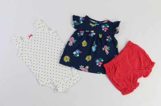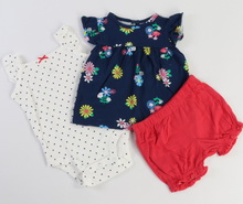 سه تکه کارترز carter's، ست سه تکه کارترز نوزادی دخترانه که شامل تونیک و شلوارک و بادی می باشد. این ست، یک تونیک سرمه ای رنگ گلدار دارد که آستین حلقه ای بوده و در جلو برش خورده است. برش در زیر حلقه آستینها بوده و با چینهای ریز و ظریفی به دامن دوخته شده و زیبایی و نمای خاصی به تونیک داده است. لباس در پشت با یک دکمه و بندینک بسته می شود. بادی، آستین حلقه ای بوده و به رنگ سفید خالدار می باشد. در پایین بادی دکمه ی فشاری کار شده است. شلوارک این ست نوزادی، کمرکش و به رنگ قرمز می باشد. دمپاهای این شلوارک نوزادی کشدوزی شده است. این ست از پارچه ی 100% نخ پنبه می باشد که با توجه به لطافت و نرمی و خنکی این نوع پارچه، کودک می تواند این لباس را در روزهای گرم بهار و تابستان بپوشد. سایز بندی این محصول، برای کودکان 6 تا 24 ماهه مناسب می باشد. باید دقت کرد که این ست را باید با آب ولرم شست، زیرا شستن لباس با آب داغ الیاف آن را از بین می برد.