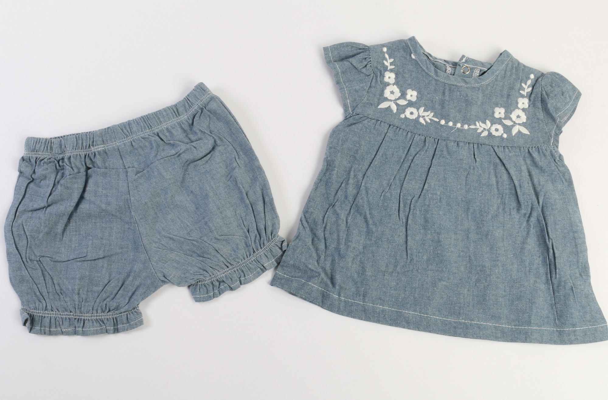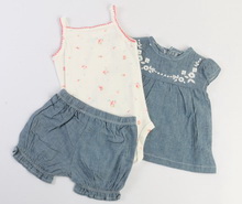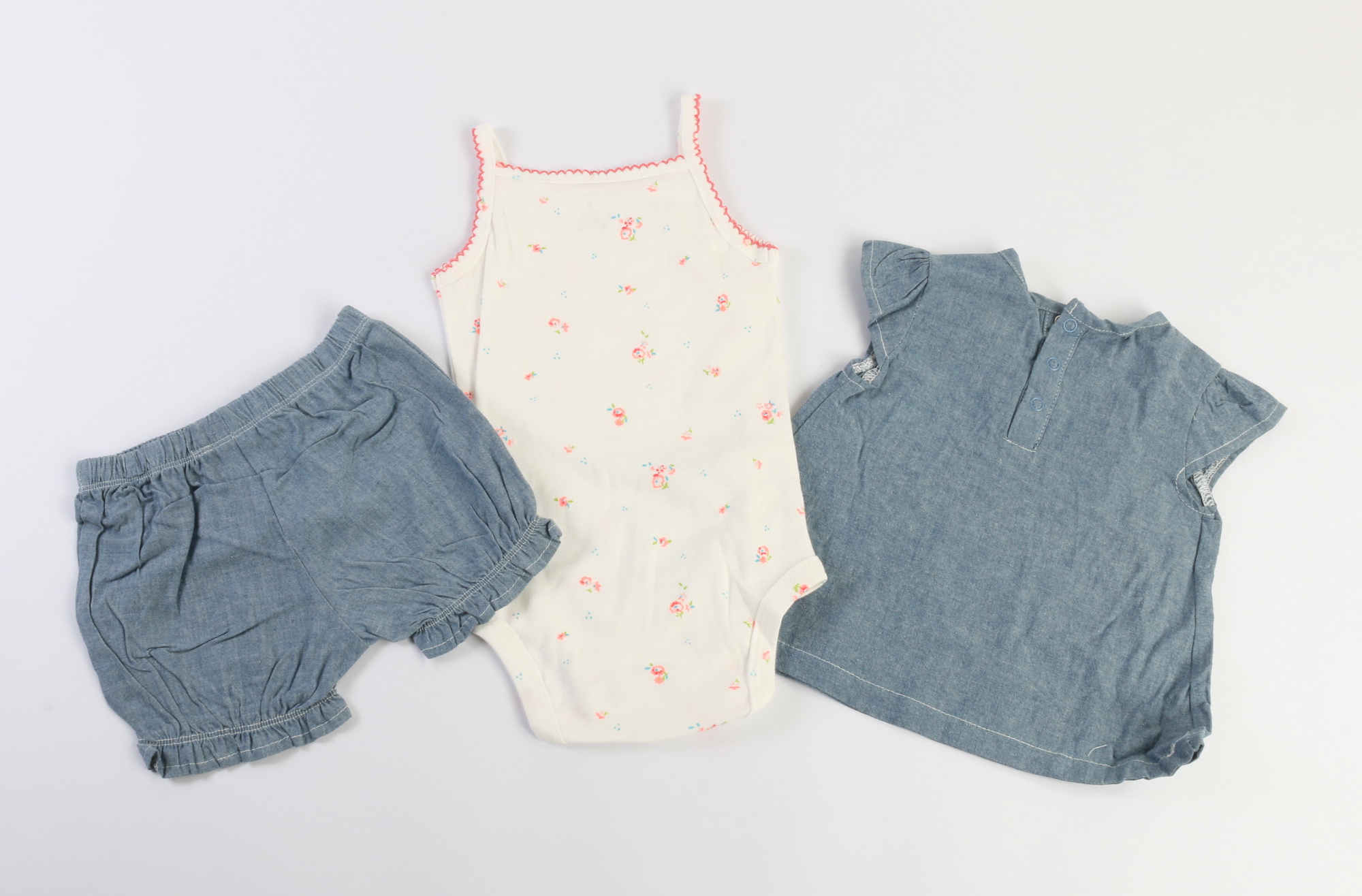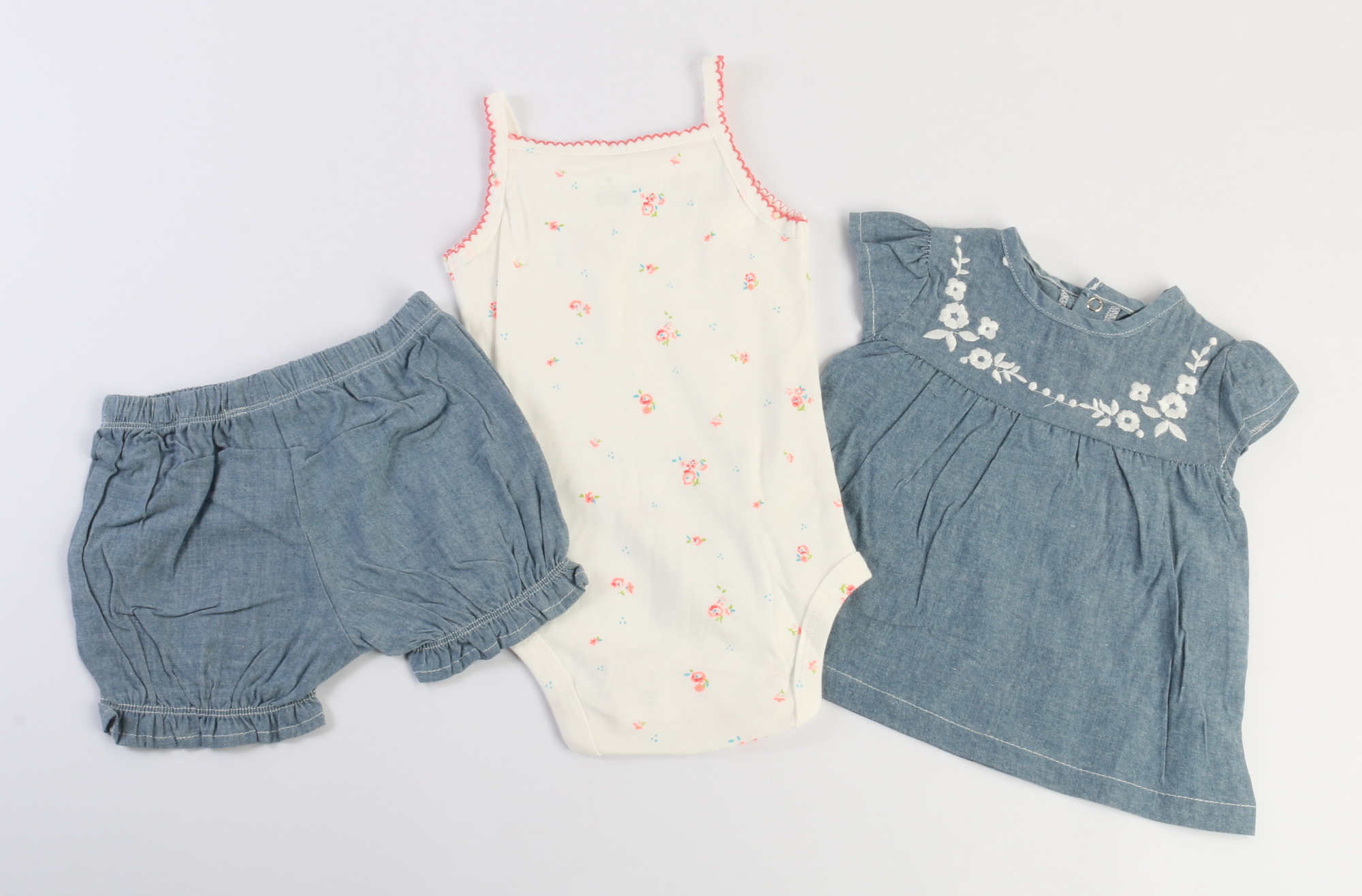 سه تکه کارترز carter's،ست سه تکه نوزادی دخترانه که شامل تونیک, بادی و شلوارک می باشد.تونیک و شلوارک طرح جین آبی می باشد و قسمت بالاتنه ی تونیک با طرح گلدوزی شده تزیین شده است و پایین تنه ی آن کمی چین دار می باشد.بادی به رنگ شیری بوده و دارای طرح زمینه گلدار می باشد.این ست مناسب فصل تابستان می باشد.