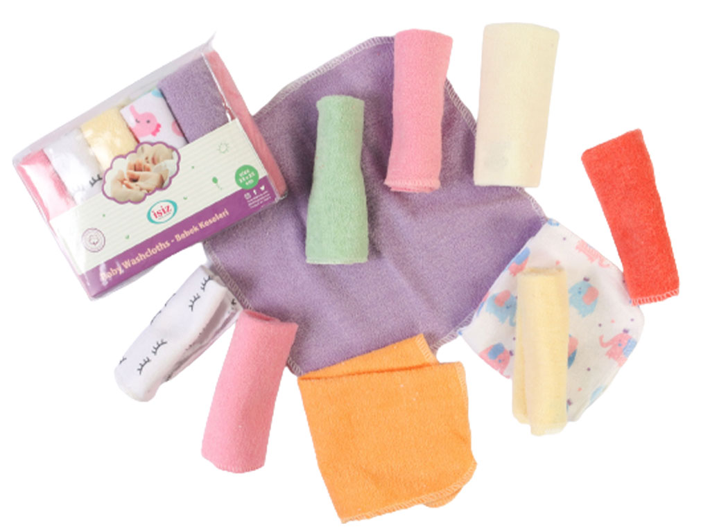 #حوله دست و صورت10عددی isiz، حوله دست و صورت نوزادی دخترانه 10 عددی است که دارای رنگ ها و طرح های مختلف و شاد می باشد که باعث افزایش روحیه نوزاد می شود. ابعاد این حوله ها 21*22 سانتی متر است
