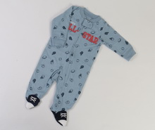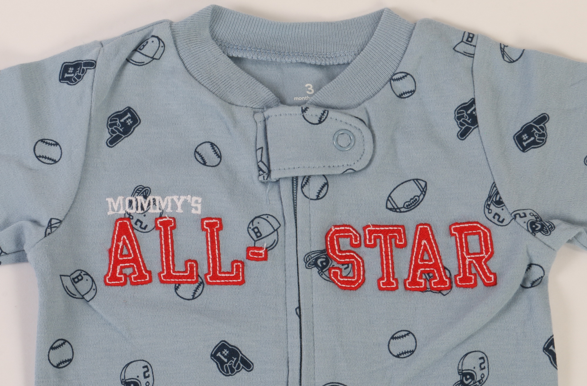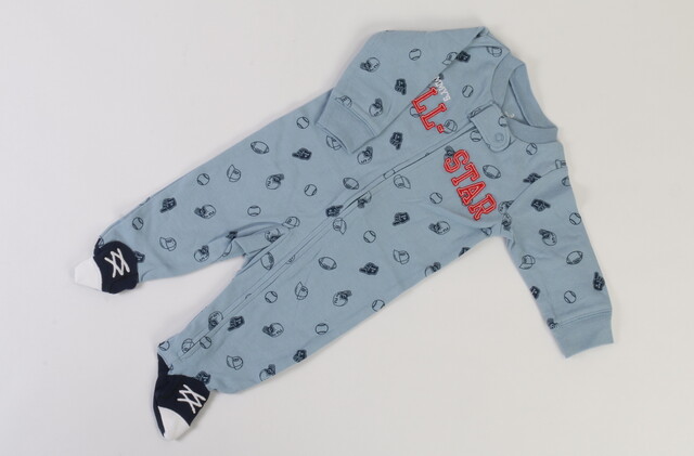 سرهمی carter's، سرهمی جورابدار نوزادی پسرانه کارترز که آستین بلند بوده و یقه ی گرد دارد. این سرهمی دارای رنگ آبی متمایل به خاکستری و طرح ورزشی می باشد. جورابهای این سرهمی طرح کفش ورزشی سرمه ای بند دار دارد و قسمت جلوی لباس زیپ سراسری دارد و در قسمت یقه یک دکمه فشاری به کار رفته است تا شما بتوانید به راحتی لباس را بر تن کودکتان بپوشانید. جنس سرهمی از پارچه ی 100% نخ پنبه بوده و روی سرهمی طرح نوشته تکه دوزی قرمز رنگ با حروف انگلیسی دارد.