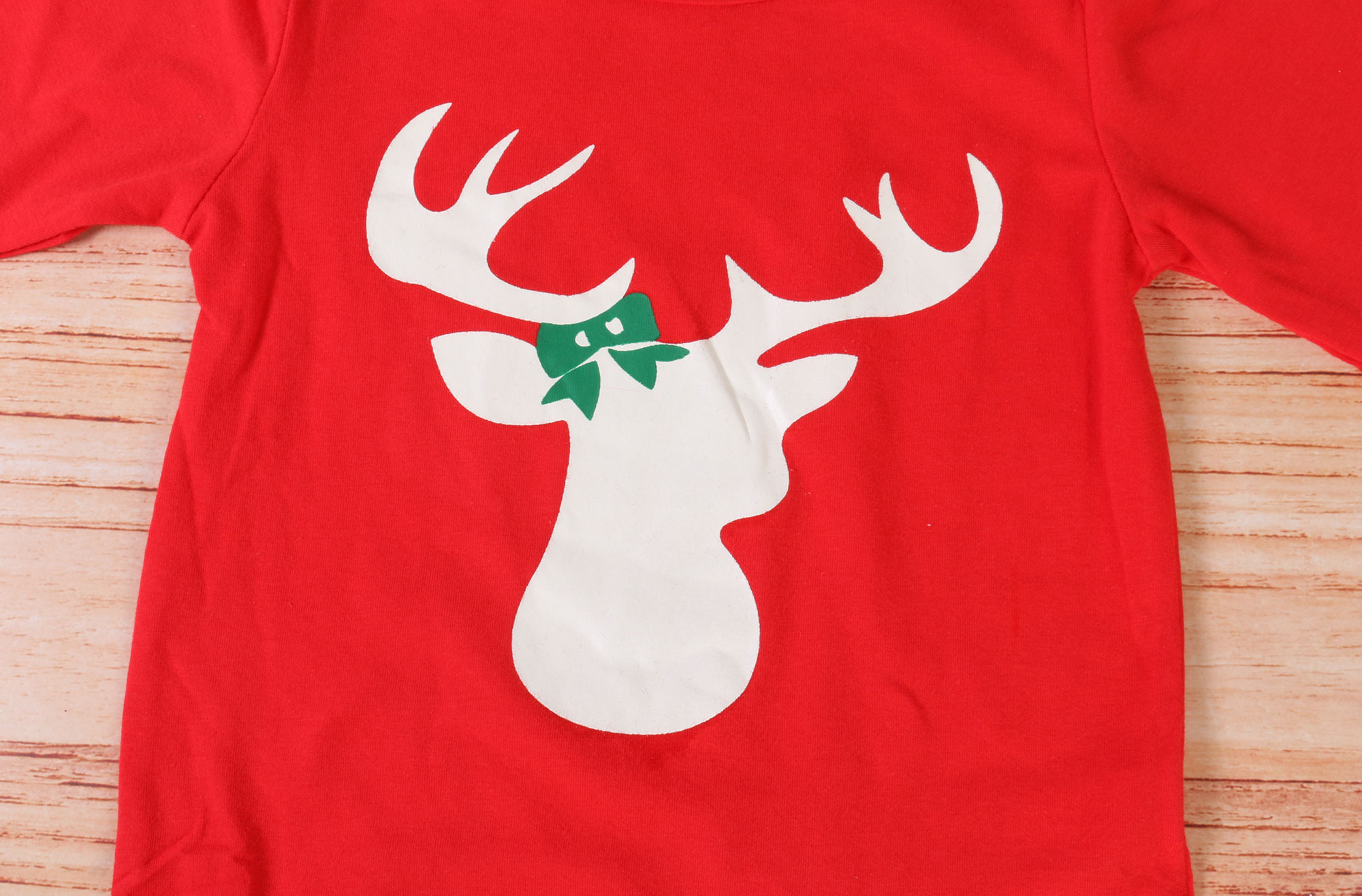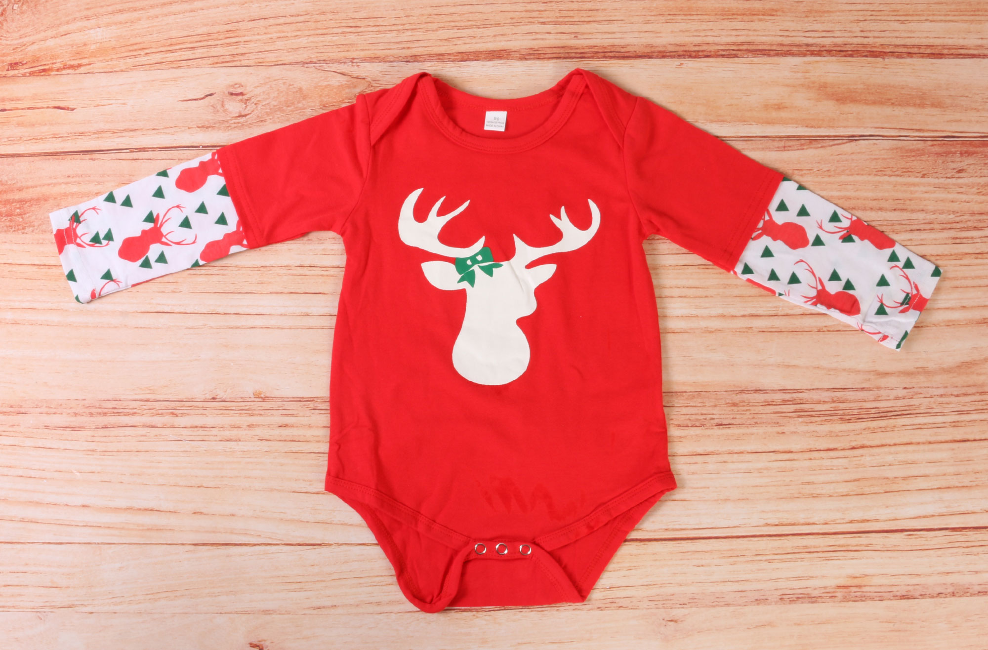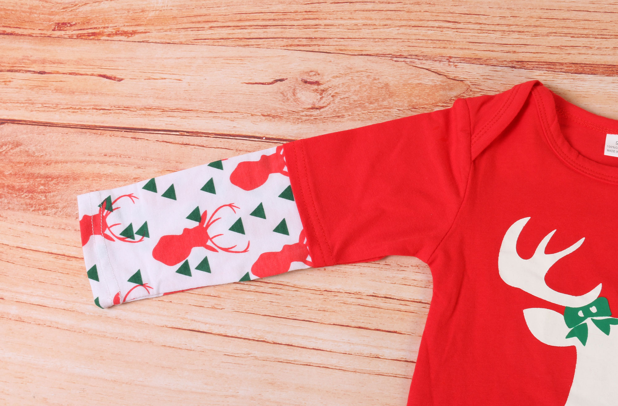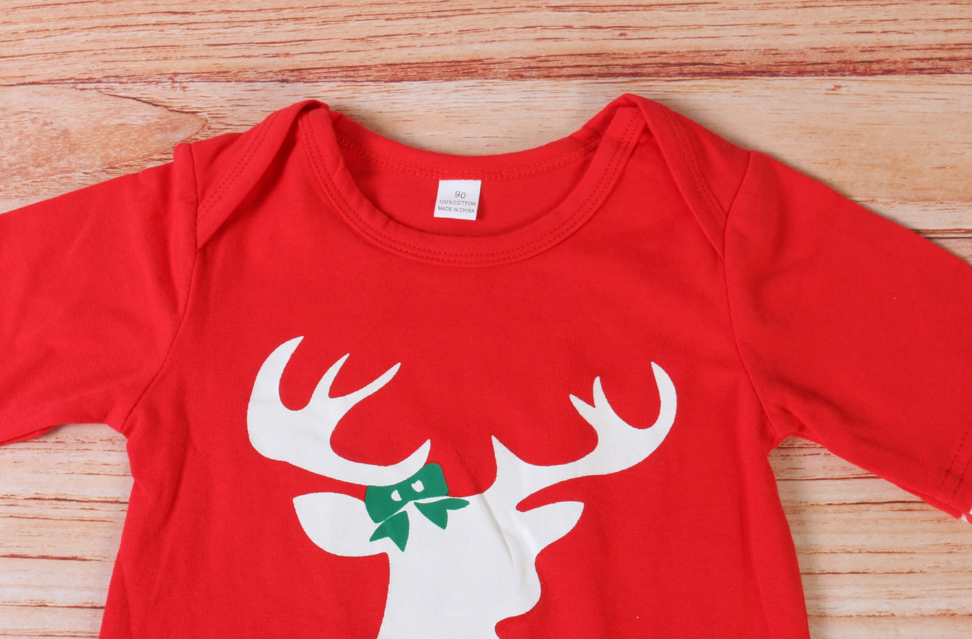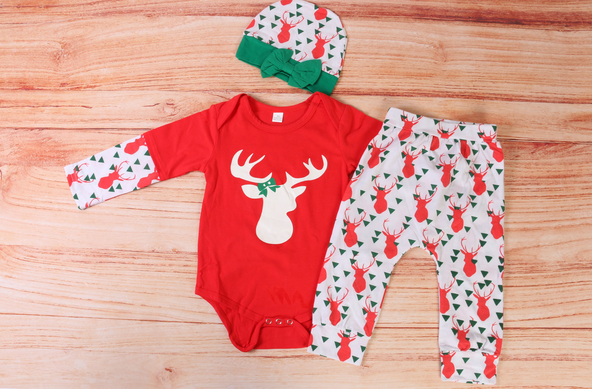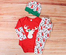 #ست سه تکه نوزادی، ست سه تکه ی نوزادی دخترانه که رنگ ان ترکیبی از قرمز، سبز و سفید می باشد و دارای طرح گوزن است.