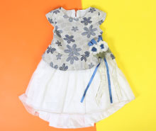 پیراهن مجلسی estella، پیراهن مجلسی دخترانه که بالاتنه با زمینه رنگی نقره ای و گل های آبی با ترکیب رنگ طلایی که با گل برجسته زینت یافته است و قسمت دامن لباس از جنس حریر با حاشیه ی طلایی که قسمت پشت آن کمی بلند تر از جلو می باشد. بالاتنه پیراهن نیز ترکیب نخ و پلی استر است.