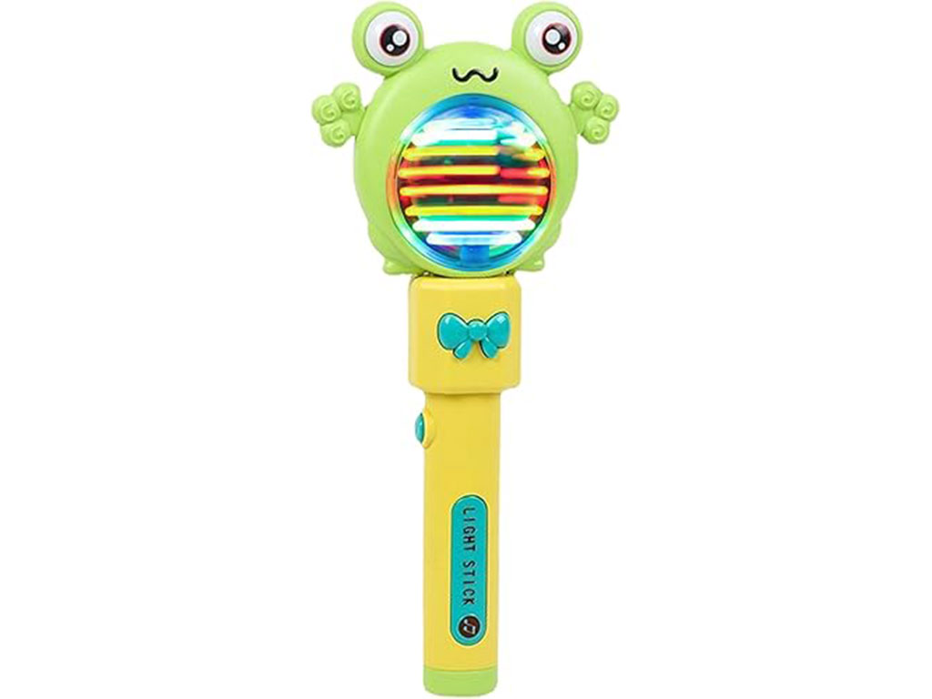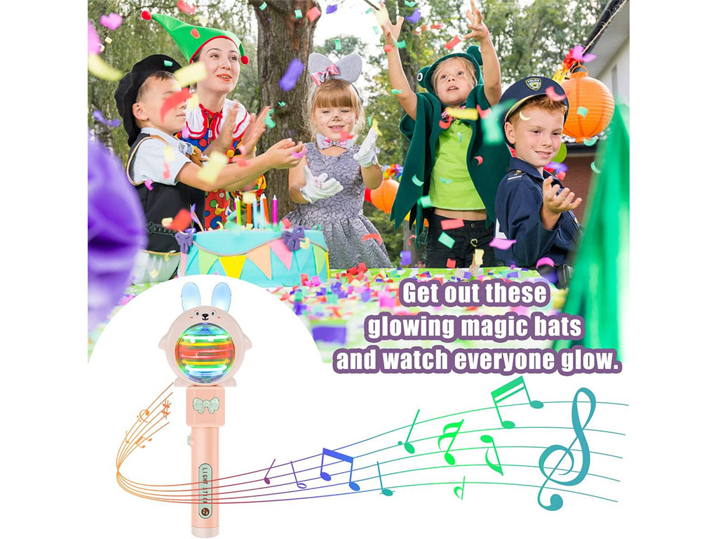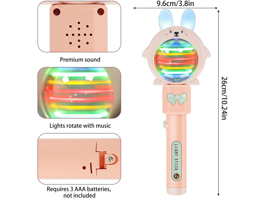 حلقه داخل چوب جادویی دارای چراغ های LED رنگارنگ است که با فشردن دکمه روشن و خاموش اسباب بازی، مانند یک توپ زیبای رنگی می چرخد و صدای موزیک آرامش بخش و زیبایی پخش می گردد.