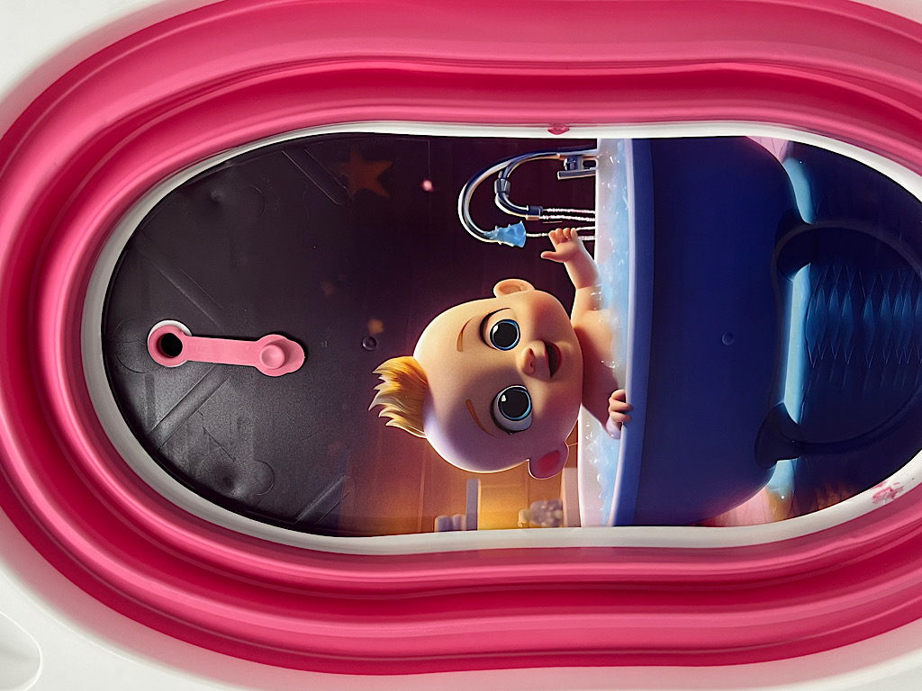 وان حمام نوزاد و کودک دخترانه به رنگ صورتی که طرح باب اسفنجی کف آن کار شده است. با فشردن دکمه کنار پایه های وان می توانید آن را باز و یا جمع نمایید. دریچه تخلیه آب در کف وان قرار گرفته که وان را به یک آسان شور تبدیل می نماید و می توانید آب و کف جمع شده در وان را خارج نمایید.