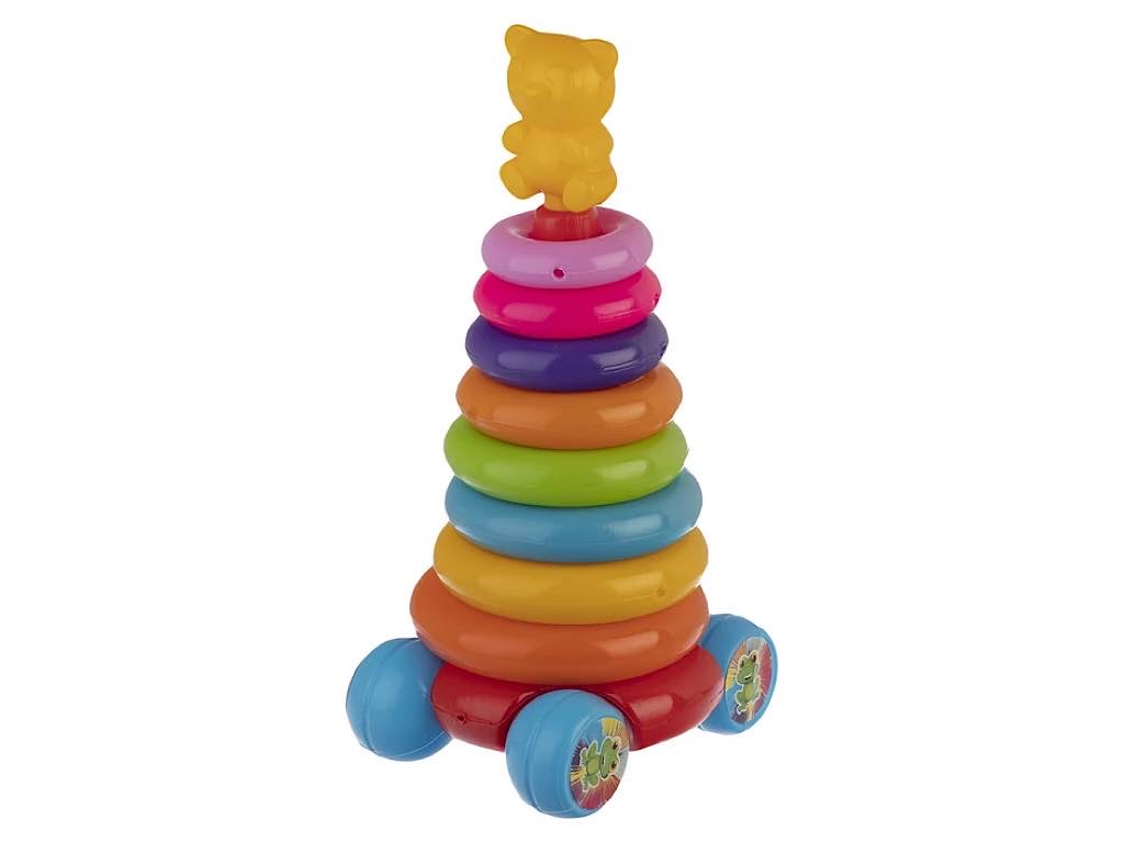 حلقهی هوش چرخ دار یک اسباب بازی فکری آموزشی است . کودک می بایست حلقهها را از بزرگ به کوچک تشخیص داده و در میله جایگذاری کند. ارتفاع این حلقه 40 سانتی متر است .کف این حلقه پایه با چهارچرخ دارد و کودک میتواند با بندی که به آن متصل است حلقه را به دنبال خود بکشد. کودک باید از قدرت منطق و استدلال برای تشخیص نظم بین حلقهها و جایگذاری آنها استفاده کند. با فشار دادن حلقهها در میله مهارت حرکتی ظریف (عضلات دست) تقویت میشود که در آینده برای در دست گرفتن صحیح مداد خیلی اهمیت دارد. در حین بازی در مورد راههای مختلف چیدن حلقهها با کودک گفتگو کنید تا منطق و قدرت فکر کردن او تقویت شود.
